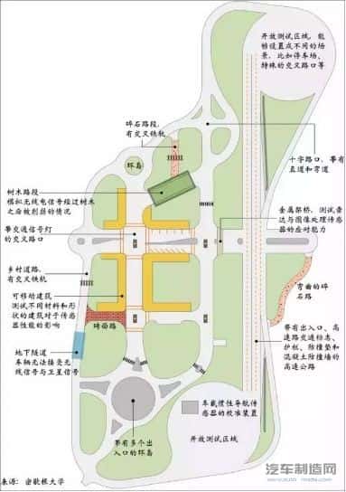 无人驾驶技术的测试一直是个难题,纯实验环境下注定永远只是个研究项目,上公共车道又面临诸多安全与法规限制,为此美国2015年专门圈地建造了一座模拟城市——MCity。这座由密歇根大学主导、密歇根州交通部支持的无人驾驶虚拟之城位于Ann Arbor,占地32英亩(相当于12.9万平方米),投资达1000万美元,是全球首座专为测试自动驾驶汽车、V2V/V2I车联网技术而打造的,经过环境变量控制设计的模拟小镇。