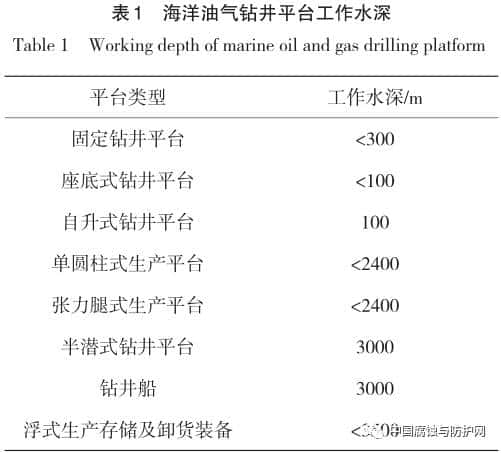 海洋平台装备按功能分主要有三大类:海上钻井类装备、海上生产类装备及海洋开发船舶 。海洋钻井类装备主要分2类:移动式和固定式。生产类装备主要分为:固定式与浮动式。随着开发向深海不断发展,固定式需求逐渐减少,目前以浮动式为主。海洋开发船舶主要包括钻井船及辅助开发用船等 。海洋平台装备分类如图1所示,海洋平台工作水深见表1。