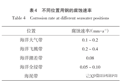 7)高耐腐蚀性能。海洋平台用钢长期服役于盐雾、潮气、海水和干湿交替等复杂环境中,受到海水及海生物等的侵蚀作用而产生腐蚀 ;漆膜易发生皂化、老化等问题,产生严重的结构腐蚀;Cl - 易吸附在金属表面,导致阳极溶解发生,形成点蚀,甚至会发展为裂纹源,在氢的共同作用下导致应力腐蚀开裂 ,这些问题降低了海洋平台用钢的力学性能和使用寿命。又因为海洋平台服役周期长、远离海岸,随开发深度不断提高,定期维修和保养非常困难,所以对海洋平台用钢耐腐蚀性能的要求不断提高。海洋平台用钢处于不同的海洋环境中腐蚀机理和腐蚀速率差别较大,对耐腐蚀性能的要求也不同,不同位置用钢的腐蚀速率见表4 。目前的研究主要是利用不同元素和组织对钢耐蚀性的影响,开发耐海水腐蚀用钢 ;完善并开发海洋用高强钢的腐蚀防护方法;加强应力腐蚀开裂的防护和研究;优化冶金、焊接等工艺,降低腐蚀开裂的可能性。现在防止海水腐蚀常采用增加腐蚀裕量、涂层保护和阴极保护等方法。