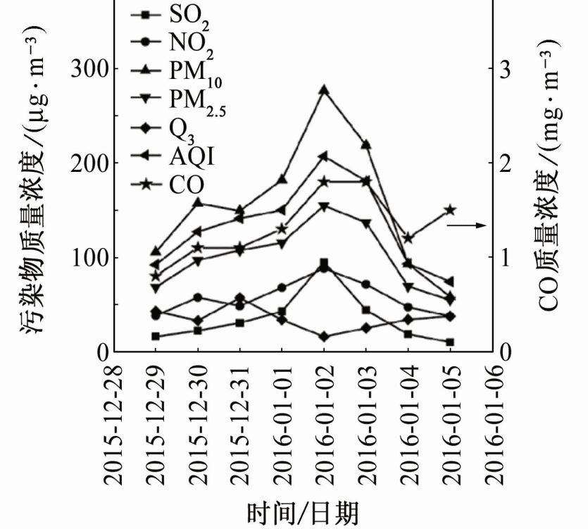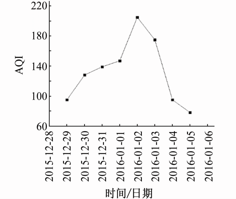 随着国民经济的增长,工业生产的日益频繁和居民生活排污的增加,导致大气中SO2?NO2?H2S等气体的含量增加,加速了大气腐蚀。在沿海地区,温度、湿度及盐分对大气腐蚀也有显著影响。另外,大气中的尘土粉体颗粒等固体污染物也是加速大气腐蚀的一个重要因素。近些年,资源型经济地区由于资源过度消耗,致使当地环境遭到前所未有的破坏,重污染天气指数呈直线上升趋势,具有持续时间长、影响范围广等特点。因此,各地区针对其大气污染的监控和防治工作也受到了广泛关注,并逐渐开展了监测研究。有研究针对2016年济南市大气重污染期间的空气质量及其污染物组分特征进行了分析,结果表明,济南市受工业污染影响,市辖区空气污染物浓度是清洁对照组的三倍,污染程度较高,水溶性离子浓度由高到低依次为:SO42- >NO3- >NH4+ >Cl- >K+ >Na+ >Ca2+ >F-,且大气中SO2和NO2的二次氧化程度较高。也有研究人员对2016年南昌市主要的大气污染过程及其污染物(PM2.5)进行了综合分析,结果发现重污染时段PM2.5主要组成为SO4- ?NO3-以及NH4+,三者浓度占比高达42.1%,大气污染物中有机碳(OC)的质量分数为4.73%,wNO3-/wSO42-均值为0.85,明显高于正常的0.56,重污染期间各污染物具体质量浓度和空气质量指数(AQI)如图1所示。