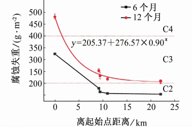 图2所示为广东茂名和云浮两地的工业污染大气环境的腐蚀监测点数据图。两组数据的采集点分别位于火力发电厂污染区和水泥厂污染区周围,污染区中心位置酸性气体质量浓度分别高达13.1μg/m3和16.3μg/m3,属于C3及以上腐蚀级别(腐蚀等级按照腐蚀严重性由高到低一般分为C1~C5级)。