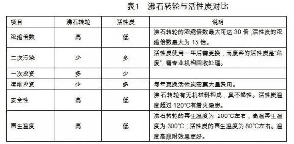 涂装车间生产过程中会产生大量VOC废气,其特点是浓度低,风量大。若采用常规焚烧法治理废气,会产生高昂的运行费用。沸石转轮和活性炭均是将低浓度大风量的VOC气体浓缩成高浓度小风量的装置,沸石转轮与活性炭使用条件和原理相似,但沸石转轮诸多性能都优于活性炭。