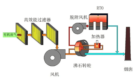 沸石转轮脱附产生的高浓度废气通过RTO风机进入RTO内进行焚烧,使废气中的VOC高温分解为CO2和H2O。