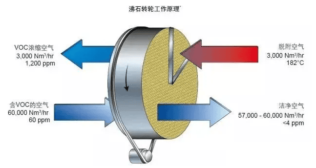 沸石转轮是一种可连续进行吸附和脱附操作的气体净化装置,两侧由密封装置分成三个区域:吸附区、脱附区及冷却区域。