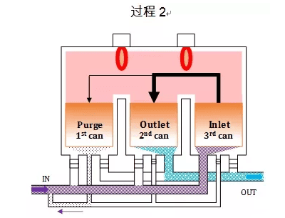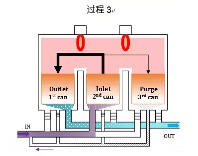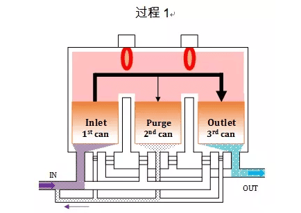 三室体在过程1中蓄热体被加热储存了热能,阀门切换气流,第三室体成为“入口”。从一室体引入未经处理的气体,将被吹扫返回到工艺气体中,以避免在开关切换期间排放未经处理的气体。